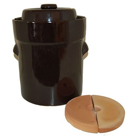 Vasi fermentatori per verdure. Bordo superiore realizzato per contenere acqua e rendere ermetica la chiusura. Forniti con coperchio e pesi. Colore marrone.