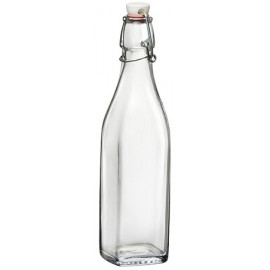Bottiglia in vetro con tappo dotato di chiusura ermetica a leva. Pianta quadrata. Lavabili in lavastoviglie rimuovendo il tappo ad ogni lavaggio. Colore trasparente.