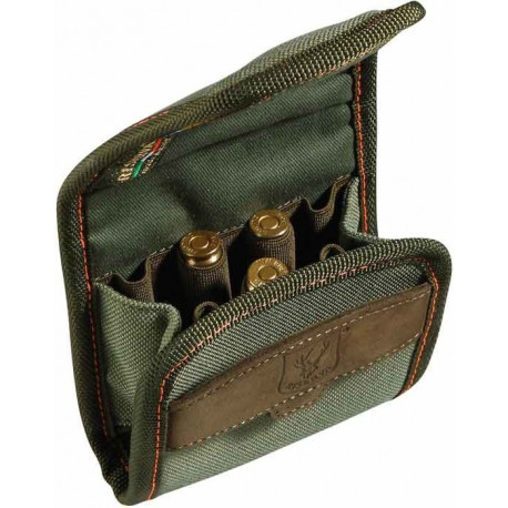 Portacolpi in cordura naturelle chiuso ai lati, 7 celle multicalibro, inserti elastici per la tenuta dei colpi, ricamo in filo arancio, passanti per cintura e chiusura silenziosa in pelle senza metallo con semplice sistema a incastro.