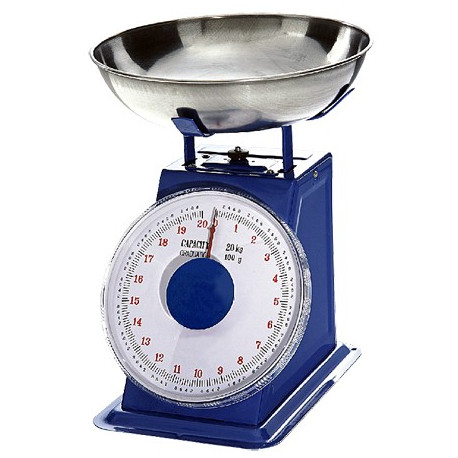 Bilancia meccanica, corpo in metallo verniciato. Dotata di un ampio quadrante, precisa e affidabile. Divisione pesata 100 grammi. Piatto in acciaio, rotella di azzeramento. Diametro del piatto mm 255, altezza mm 56. Portata kg 20.