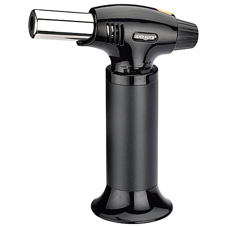 Torcia a gas ricaricabile con regolazione della fiamma e blocco di sicurezza, colore nero. Dimensioni cm 10,0x11,5.