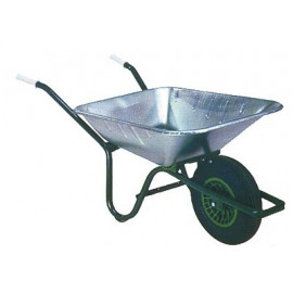 Carriola con vasca in acciaio zincato. Telaio tubolare in acciaio verniciato. Ruota mm 400x100 con pneumatico rinforzato a 2 tele e mozzo su cuscinetti. Volume l 90