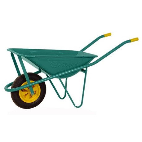 Carriola con vasca in polietilene super resistente al taglio ed all'abrasione, adatto per edilizia. Telaio tubolare in acciaio zincato, rinforzato. Ruota mm 400x100 con camera d'aria pneumatico rinforzato a 4 tele e mozzo su cuscinetti. Volume l 90