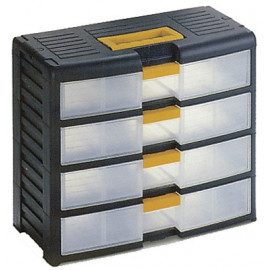 Cassettiera modulare trasportabile, con maniglia ergonomica a scomparsa. 4 cassetti con divisori mobili e chiusura brevettata. Dimensioni (L x P x H) mm. 391 x 197 x 334