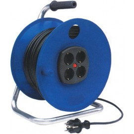 Cavalletto in acciaio zincato, tamburo in polipropilene. Spina Schuko 2P+T 16A. 4 prese Schuko 2P+T 16A. Cavo Sezione 3 x 1,50 mm2. Con disgiuntore.