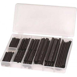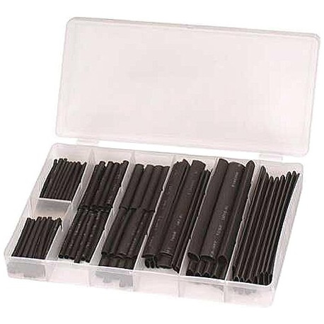 Assortimento di guaina termoretraibile da 127 pz. Composto da 7 misure. Colore nero. Composizione assortimento: 30 pz. 2,0x40 mm - 25 pz. 2,5x40 mm - 20 pz. 3,5x40 mm - 20 pz. 5,0x40 mm - 16 pz. 7,0x80 mm - 8 pz. 10,0x80 mm - 8 pz. 13,0x85 mm =