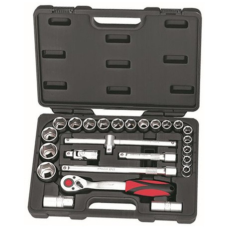 Serie chiavi a bussola 25 pz, con cricchetto attacco da 1/2" con 72 denti, 2 prolunghe da 125 e 250 mm, 1 snodo, 1 quadro maschio, 2 bussole prolungate da 16 e 21 mm. Misure bussole da 10 mm a 32 mm. In valigetta.