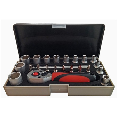 Serie chiavi a bussola 23 pz. con cricchetto reversibile a 72 denti attacco da 1/4". Misure bussole da 4 mm a 13 mm. Con estensione da 100 mm, adattatore bit e 8 bits.