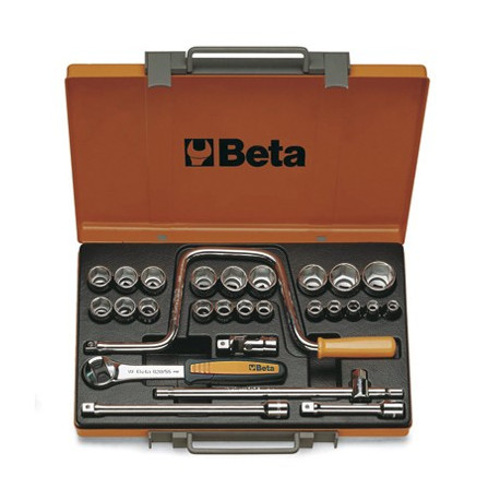 In cassetta di lamiera con 21 chiavi a bussola da mm. 10 a mm. 32 e 6 accessori.
