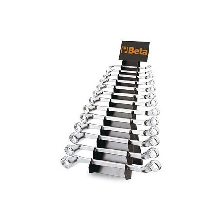 Serie di chiavi combinate in acciaio al cromo vanadio, finitura cromata, testa lucida. Da 6 a 32 mm. Chiave con testa piatta, anello di 12 punti con profilo ondulato, piegato a 15 gradi. In astuccio morbido ripieghevole.