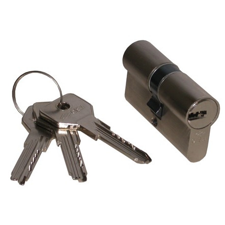 Cilindro Asix in ottone nichelato, frizionato con chiavi punzonate a 6 perni. Resistenza al trapano con primo perno e controperno in acciaio cementato. In dotazione 1 vite di fissaggio e 3 chiavi.