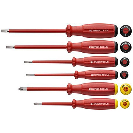 Set giraviti VDE SwissGrip, completamente isolati fino a 1000 V AC / 1500 V DC secondo IEC/EN 60900. Impugnatura con rivestimento in elastomero. 4 pezzi taglio (1, 3, 4, 5) + 2 pezzi PH (1, 2).