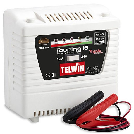 Caricabatterie con controllo elettronico delle fasi di carica, interruzione e ripristino automatico (TRONIC). Carica batterie tipo WET, GEL, Pb-Ca, AGM, MF, EFB con tensione 12/24 V. Segnala lo stato di carica della batteria tramite LED. Dotato di protezione contro sovraccarichi, inversione di polarita' e riconoscimento della tensione della batteria. Potenza assorbita 230 W. Dimensioni 10x19x19 cm