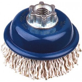 Progettata per utilizzo su elettroutensili portatili. Adatta per lavorare su superfici estese. Filo in acciaio arricciato in trefoli da 9 fili (3x0,20 e 6x0,35) rivestiti di plastica. Diametro mm 75. Attacco 14MA. Rotazione max 15000 giri/min.