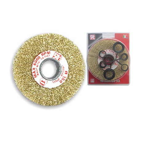 Spazzola circolare per mola. Con filo acciaio ottonato diametro mm 0,3. Progettata per operare a regimi di rotazione (circa 6.000 giri/min). Dimensioni mm 150 x 36. Foro dia mm 38. Kit di riduzione foro da 16-20-25 mm.