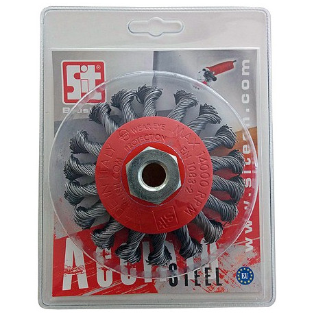 Spazzola professionale conica con filo in acciaio diametro mm 0,5 ritorto in trefoli. Progettata per operare ad elevati regimi di rotazione (circa 14.000 giri/min). Dimensioni mm 95 x 20. Attacco M14.