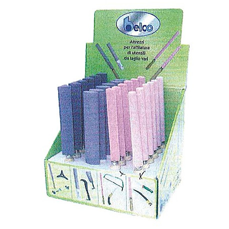 Espositore da 24 lime smerigliate. Composizione espositore: n.6 lime triangolari per falciatrice, n.6 lime triangolari per seghe rosa, n.6 lime coniche rosa, n.6 pietre coti ovali.