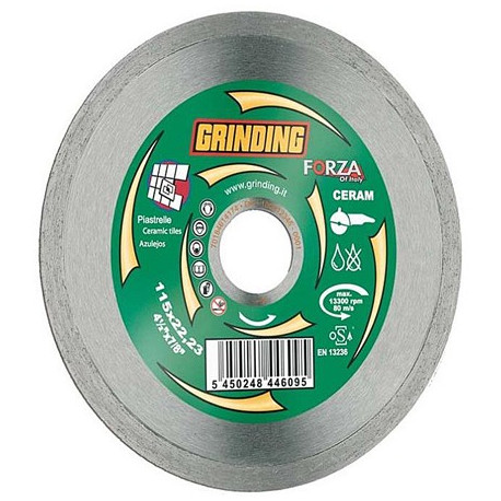 Disco con corona continua liscia indicato per taglio piastrelle in ceramica. Dimensioni 115x1,7 mm. Max 13300 giri/min. Foro da 22,2 mm.