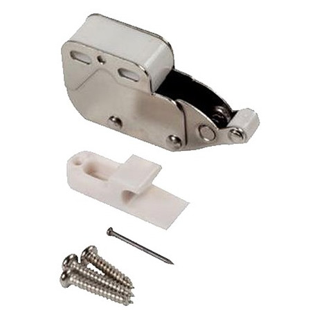 Cricchetti blocca antine. Dimensioni mm 26x33x11. In blister da 2 pz. Nichelato bianco.