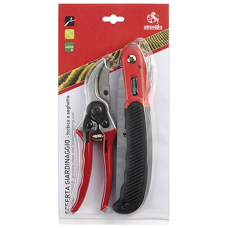 Caratteristiche forbice: corpo in alluminio, lama in acciaio speciale ad alto contenuto di carbonio. Manici ergonomici. Lunghezza 21 cm. Caratteristiche seghetto: lama cromata in acciaio di alta qualita'. Manico antiscivolo rinforzato. Lunghezza 18 cm.