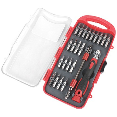 Manico gommato con testa girevole. Cacciavite con prolunga porta inserti flessibile e 1 inserti: 4 pezzi phillips:PH000-PH00-PH0-PH1; 4 pezzi piatti: 1.5-2-3-4 mm; 8 pezzi torx: T5-T6-T7-T8-T9-T10-T15-T20; 5 pezzi esagonali: 1.5-2-2.5-3-4 mm.