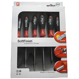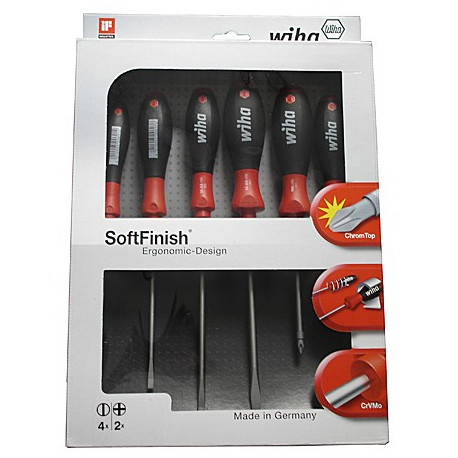 Serie 6 cacciaviti. Taglio misure mm 1,5x40 - 2,0x40 - 2,5x50 - 3,0x50. Phillips misure PH00x40 - PH0x50. Impugnatura ergonomica multicomponente. Testa girevole con ampia superficie di appoggio per le dita. Lama in acciaio al cromo-vanadio-molibdeno. Punta della lama ChromTop di alta qualita'.