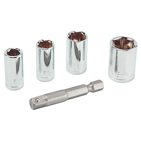 Kit 5 pz. in acciaio al cromo vanadio. Composto da 1 adattatore da 1/4' esagonale a 1/4' quadro + n.4 inserti a bussola da 7/8/10/13 mm