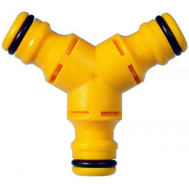 Raccordo per la connessione di due tubi al rubinetto esterno da 1'' / 3/4'' / 1/2''. Composto da 2 prese con raccordo rapido e valvola e un'uscita orientabile per l'erogazione dell'acqua. Ideale per l'impiego con sistemi automatici di irrigazione e timer.