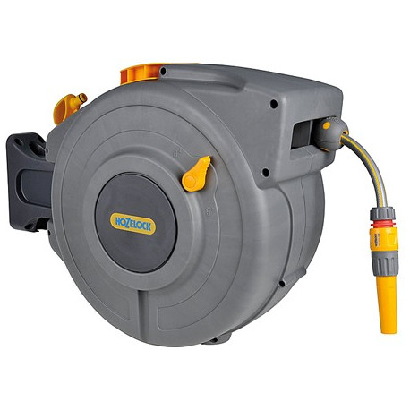 Avvolgitubo da muro con riavvolgimento automatico. 2 metri di tubo di alimentazione, lancia, raccordi e minuteria per il fissaggio a muro. Tubo da 1/2'.