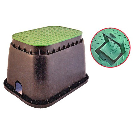 Pozzetto in polipropilene. Corpo nero e coperchio verde. Sistema brevettato con apertura a maniglia, con vite per chiusura coperchio anti vandalo. Supporto interno per centraline serie EVO.