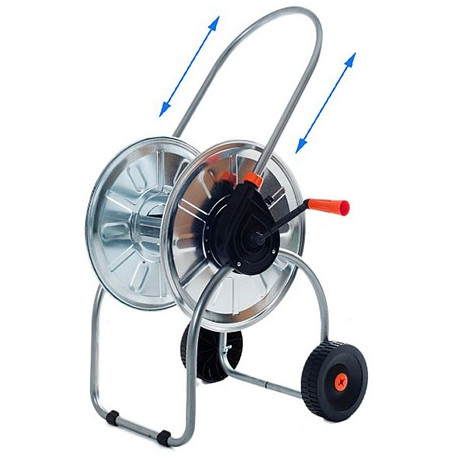 Carrello avvolgitubo in acciaio zincato. Telaio realizzato con un unico pezzo di tubo senza saldature per garantire la massima robustezza. Grazie agli speciali supporti il manico puo' scorrere per regolarne l'altezza e per ridurre l'ingombro del carrello quando deve essere riposto dopo l'uso. Dotato di manovella con anima in acciaio. Capacita' 50 mt di tubo da 1/2''