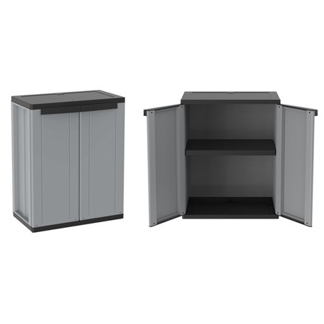 Armadietto in plastica a due ante con un ripiano interno regolabile, colore grigio-nero. Dimensioni (LxPxH) mm 680x375x850