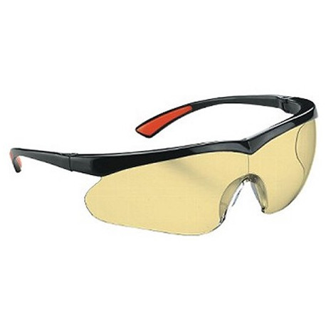 In policarbonato, struttura nera avvolgente con inserti in gomma siliconica, lenti gialle. Con trattamento antigraffio e antiappannante.