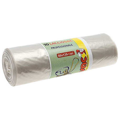 Sacchi con laccio per immondizia pratici e robusti, realizzati in polietilene per usi condominiali e unifamilari. Adatti alla raccolta differenziata. Saldatura laterale antigoccia. Colore trasparente. 10 pezzi per rotolo.