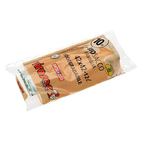 Sacco per umido con laccio di chiusura biodegradabile. Saldatura laterale estesa antigoccia. Colore neutro. Dimensioni cm 42x42. Capacita' l 12. Rotolo da 10 sacchi