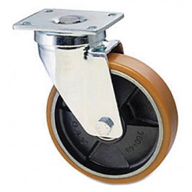 In ghisa con rivestimento in avoprene, rotanti su doppia corona di sfere alloggiate in ralle di acciaio temperato. Con supporto a piastra girevole.