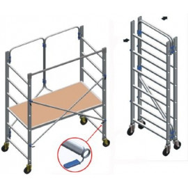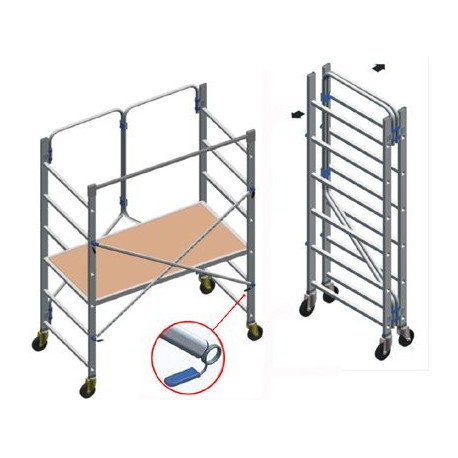 Elementi per la costruzione del trabatello professionale in alluminio a norma EN 1004 fino all'altezza max di m 9,50. Sezione delle spalle portanti mm 25x65. Dimensioni base cm 169x94. Piano di lavoro comprensivo di fascia perimetrale. Per le possibili composizioni vedi pagina a fianco. Livellatori a vite da ordinare a parte. = alzata da mm 1800 D651
