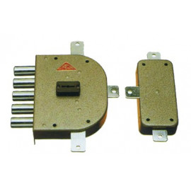 Chiusura quintupla senza scrocco, a quattro mandate con piastra corazzata e non fornita di aste. Cilindro con chiave a doppia mappa. Dimensioni scatola mm.130x164. Entrata mm.60.