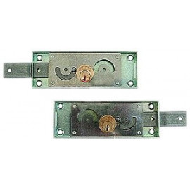 Per serramenti metallici. Con scrocco e catenaccio a due mandate, quadro maniglia passante. Dimensioni scatola mm.58x130x16. Frontale mm.195x22. Entrata mm.30