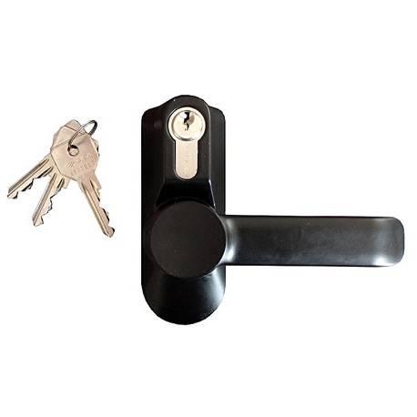 Placca con maniglia ribassata. Colore nero. In dotazione: cilindro con 3 chiavi e viti di fissaggio. Per maniglioni serie "FAST PUSH" e "FAST TOUCH".