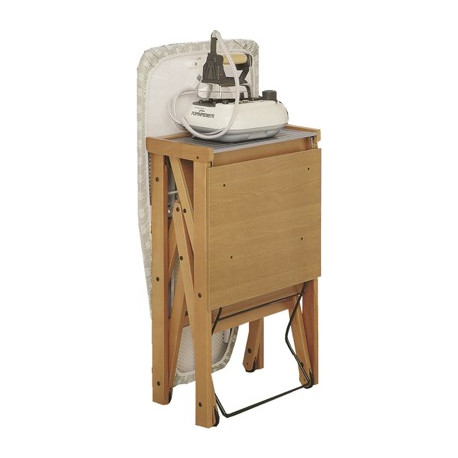 Postazione di lavoro pieghevole in legno massiccio. Molto stabile, dispone di un piano d'appoggio per ferro e per la biancheria stirata. Dimensioni aperto (lxpxh) cm 176x50x82.