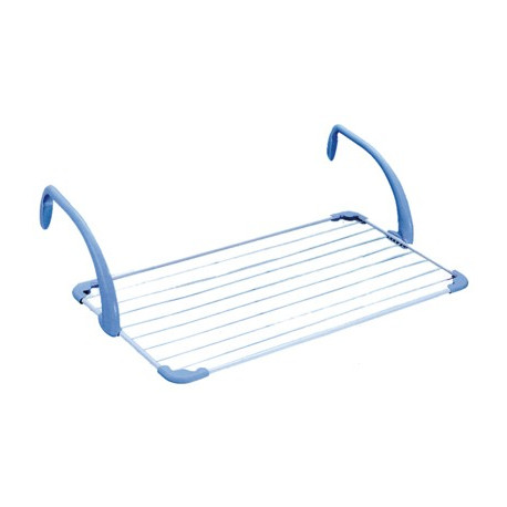 Stendibiancheria da balcone dotato di agganci regolabili per adattarlo a ogni tipo di terrazzo. Dimensioni (lxpxh)cm 109x55x27. Dispone di circa 10 m lineari per stendere. In acciaio