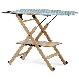Stireria pieghevole in legno dotata di ampio ripiano di appoggio per il bucato e di sostegno adatto ad ospitare anche i potenti ferri a caldaia. Dimensioni aperto (lxpxh) cm.123x50x85.