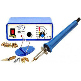 Completo di stazione con temperatura regolabile 50 - 500 gradi C. Pirografo potenza W 20 con supporto e 14 punte e stampi intercambiabili.