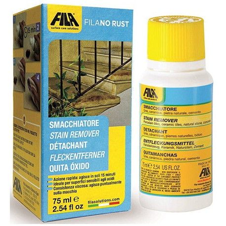 Smacchiatore per macchie di ruggine superficiali. Specifico per rimuovere le macchie di ruggine superficiali da marmo, granito, pietra naturale, agglomerati, gres porcellanato, ceramica, cotto e cemento. Contenuto 75 ml.