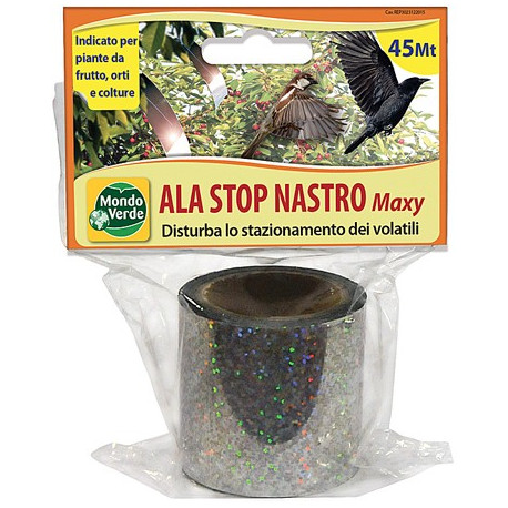 Nastro in materiale plastico con superficie oleografata, altezza 5 cm e lunghezza 45 m. Grazie alla superficie particolare scompone e riflette la luce e crea una barriera di riflessi ed effetti sonori muovendosi anche solo con una semplice brezza. Disturba i volatili impedendone lo stazionamento e la presenza. Resiste al sole e alla pioggia.