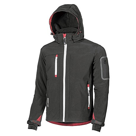 Giacca in tessuto Soft Shell stretch traspirante, antivento e idrorepellente. 96% poliestere, 4% elastene, 310 gr/m2, Con membrana TPU. Tasca portacellulare sul petto con Zip. Tasca supplementare su manica termosaldata. Cappuccio staccabile con zip. Maniche preformate. Coulisse antimpigliamento regolabile dall'interno. Polsini regolabili con buco pollice. Fondo sagomato.
