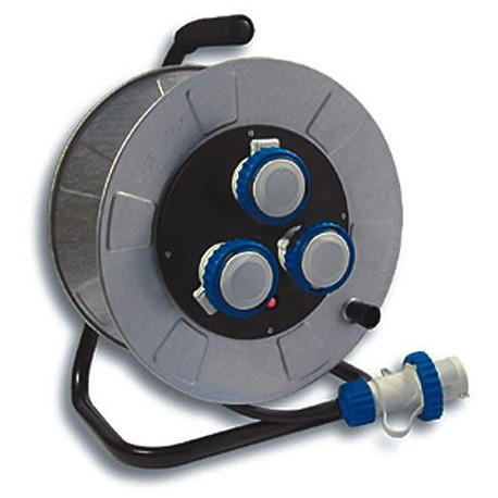 Cavalletto e tamburo metallico. 3 prese 2P+T 16A 220V-IP67. Spina 2P+T 16A 230V IP67. Sezione 3 x 2,50 mm2. Lunghezza cavo m 30. Disgiuntore. Grado di protezione IP55 =