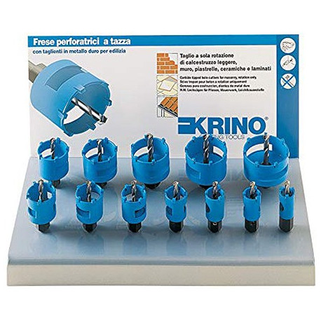 Espositore 12 pezzi seghe a tazza art. 21015, complete di gambo e punta pilota. Misure diametro mm: 22, 25, 27, 30, 35, 38, 40, 45, 50, 55, 60, 65.