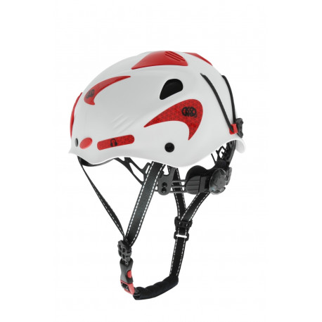 Sottogola progettato per aprirsi in caso di urto ed evitare il soffocamento: si apre tra i 15 e i 25 daN (norma caschi industria EN 397). Rotella di regolazione del girotesta facilmente regolabile anche con i guanti. Calotta dotata di fori d'areazione. Ganci di posizionamento per il montaggio di una lampada frontale. Calotta pre-forata per l'installazione di visiera e cuffie antirumore e radio. Sistema interno a "ragno" con imbottitura removibile e lavabile.